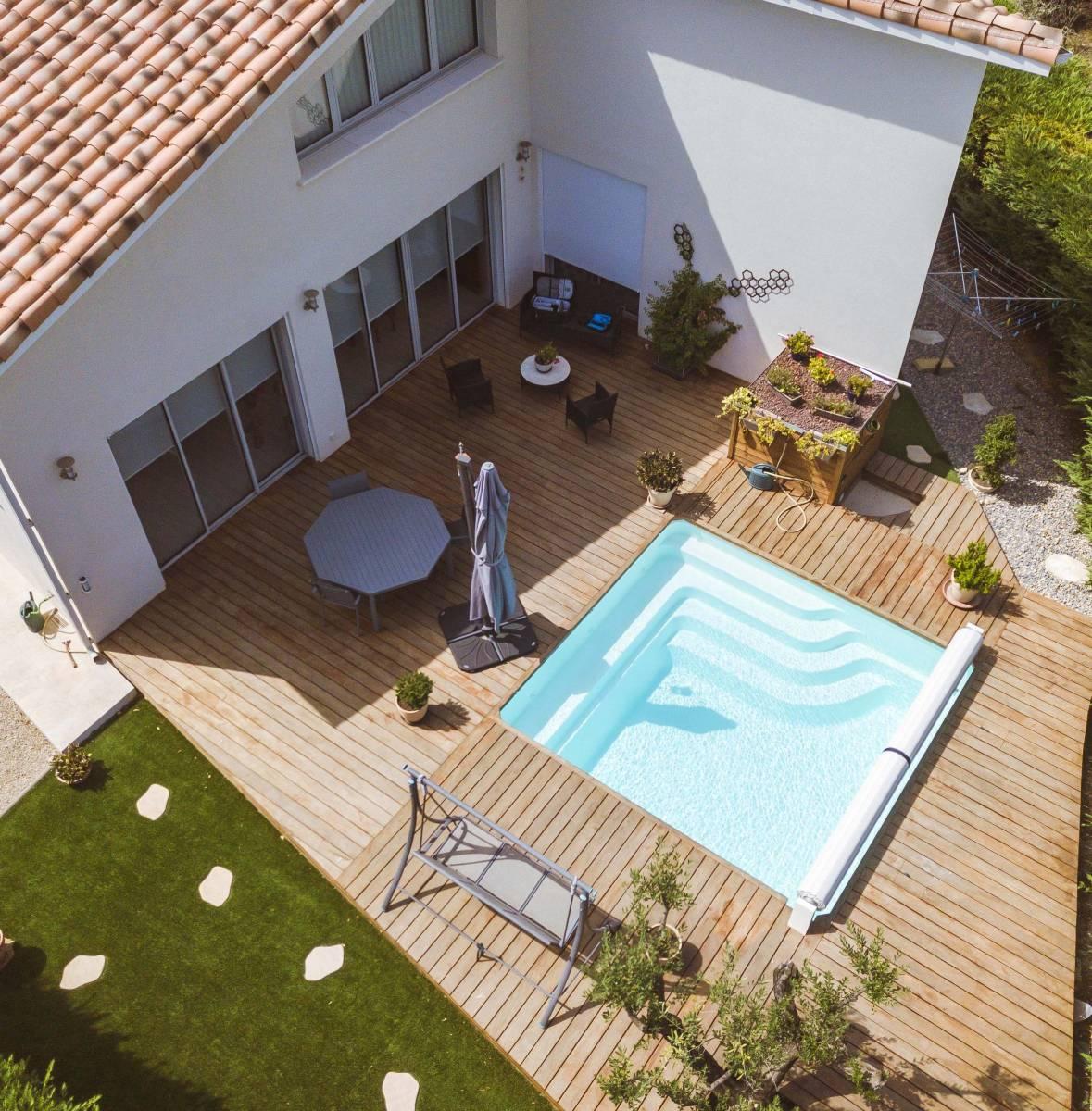 la Piscine coque polyester Mayotte allie design compact et praticité. Ses dimensions carrées de 4,20 m x 4,00 m et son escalier d’angle avec banquette intégrée offrent un confort optimal, tout en maximisant l’espace de nage.